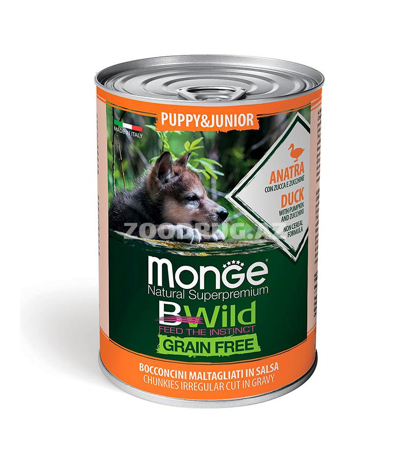 Nəm yem MONGE BWILD PUPPY & JUNIOR GRAIN FREE ördək əti və balqabaq ilə bala itlər üçün taxılsız 400 qr.